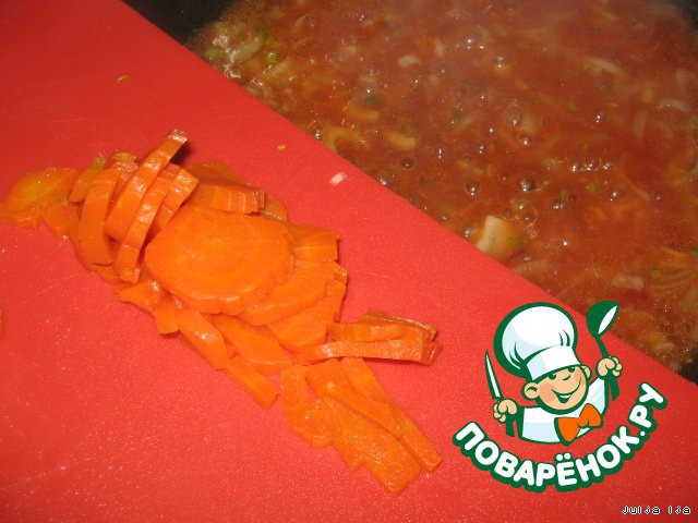 Тушим минутки две. В конце, добавляем нарезанную варёную морковь и чеснок - кружочками.