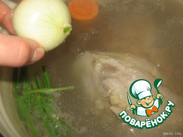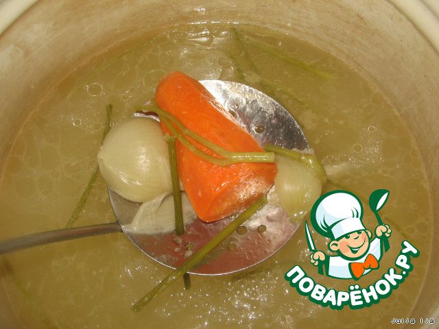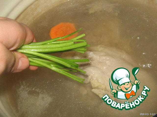 Да... Через час, после закипания, добавляем целую, очищенную и промытую морковь. У зелени (петрушка и укроп) обрезаем стебли, и тоже добавляем в бульон. Немного солим. Можно добавить чёрный перец горошком.