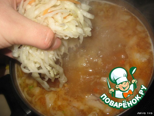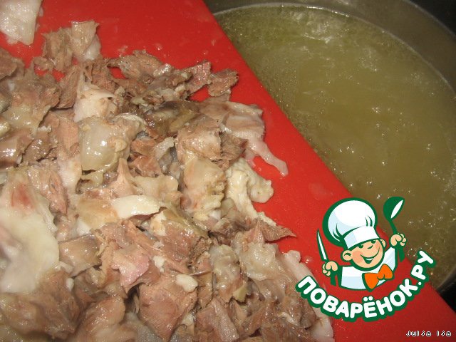 Мясо нарезаем небольшими кусочками. И отправляем в бульон.