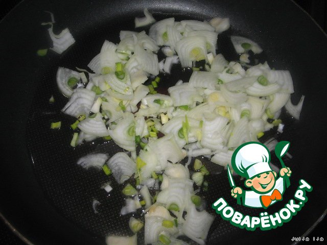 Тем временем, луковицу, нарезаем соломкой, слегка обжариваем на растительном масле.
