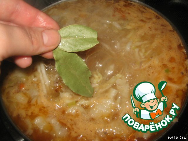 Даём провариться минуты 3-4, до кипения. В самом конце приготовления, кладём лавровый лист.