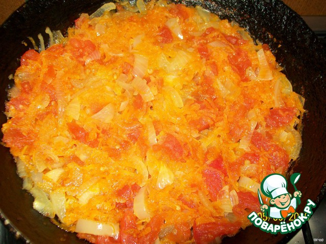 Лук, морковь, перец смешать, разделить на 2 части : одну - отправить в кастрюлю к варящейся капусте, другую - на сковородку и разогретым раст. маслом для обжарки (7-10 мин. на среднем огне)добавив сюда же и нарезанный помидор.