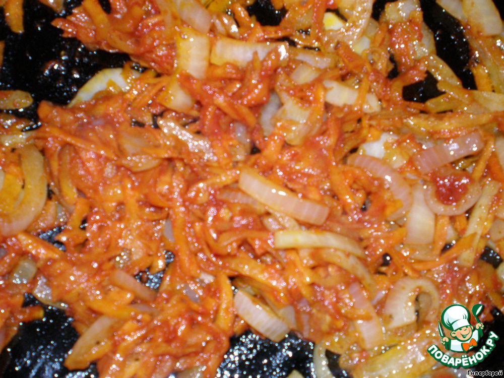 На разогретую с растительным маслом сковороду высыпаем специи, затем нашинкованный лук и натертую на крупной терке морковь, все это обжариваем. Еще, минут через пять, добавляем томатную пасту и продолжаем обжаривать до готовности.