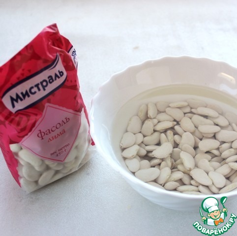 Берем фасоль от Мистраль на свой вкус, у меня Лима. Фасоль залить водой на ночь, затем воду слить, налить свежей воды в кастрюлю и варить фасоль до готовности. Мне нравится, чтобы фасоль была разваристая, поэтому предпочитаю её переварить.