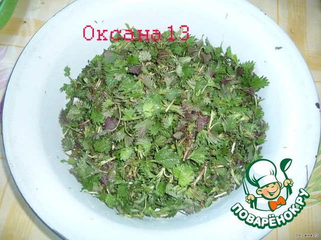 Тщательно промыть крапиву (я это делаю в хоз. перчатках), нарезать ее. Часть крапивы (у меня это более толстые стебельки) отложить.