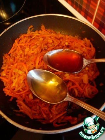 Как только овощи немного пожарятся добавляем мёд и сироп от брусничного варенья.