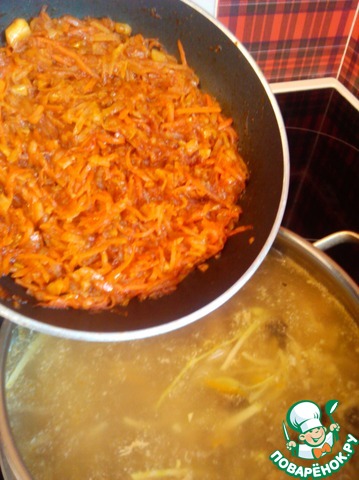 Пока все варится делаем зажарку. На сковороду наливаем масло, кладём лук и морковь, как только они обмякнут - к ним отправляем натёртую на тёрке капусту кольраби.