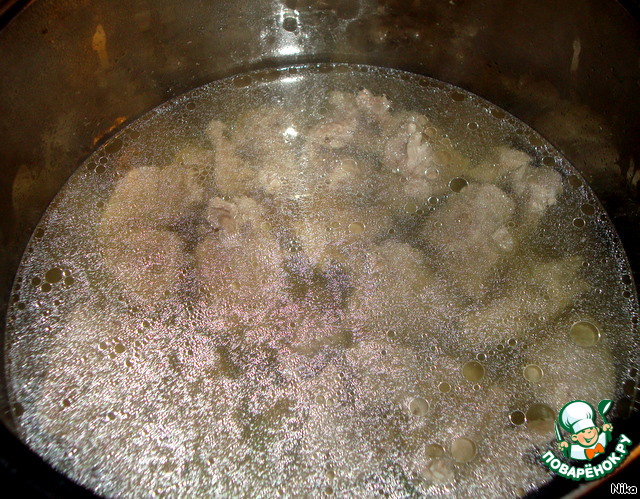 Поставить варить мясо, туда же засыпать перловую крупу (крупа была замочена в воде на несколько часов).