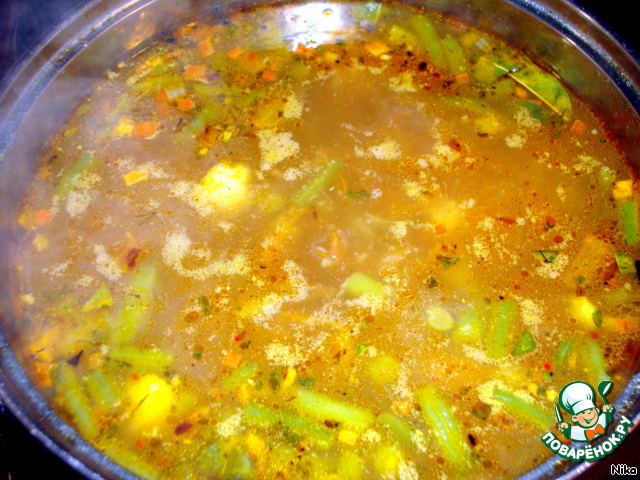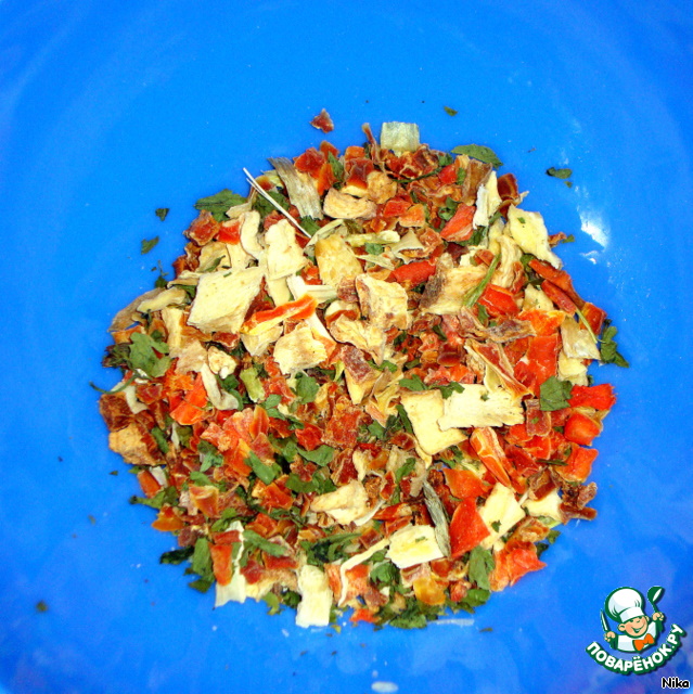 Сухие овощи и зелень добавить минут за 5-10 до конца варки щей. Положить лавровый лист и солёный укроп.