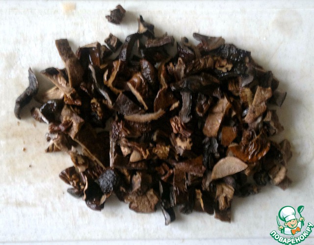 Тем временем сушеные грибы размокли, режу их мелко.