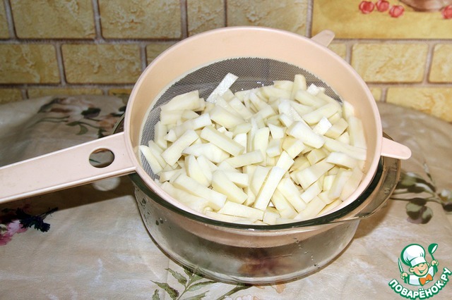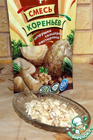 В кипящую воду выложить нарезанный картофель, пассированные лук и морковь, смесь кореньев.