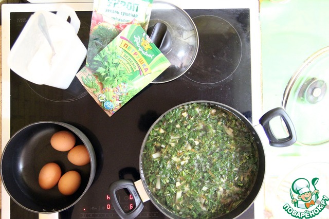 На этом этапе рекомендую посолить, выложить нарезанную крапиву и зелень.