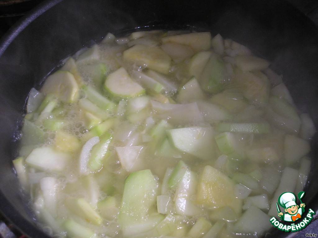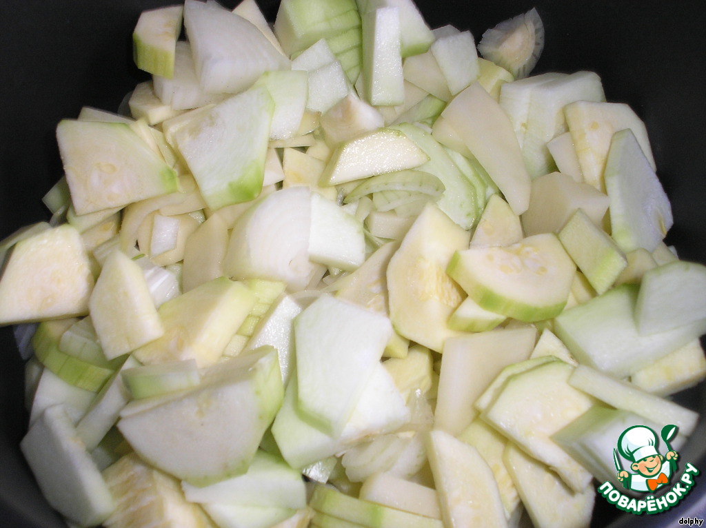 Добавьте крупно нарезанный лук, давленый чеснок, 4 крупных нарезанных кабачка и 2 очищенные нарезанные картофелины.