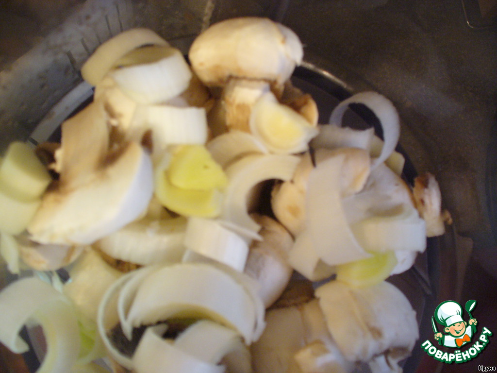 Шампиньоны чистим, режем произвольно, лук-порей режем полукольцами.