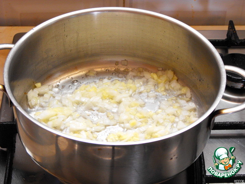 Разогрейте в кастрюле растительное масло, потушите лук с имбирём, примерно минут 5-7 на маленьком огне.
