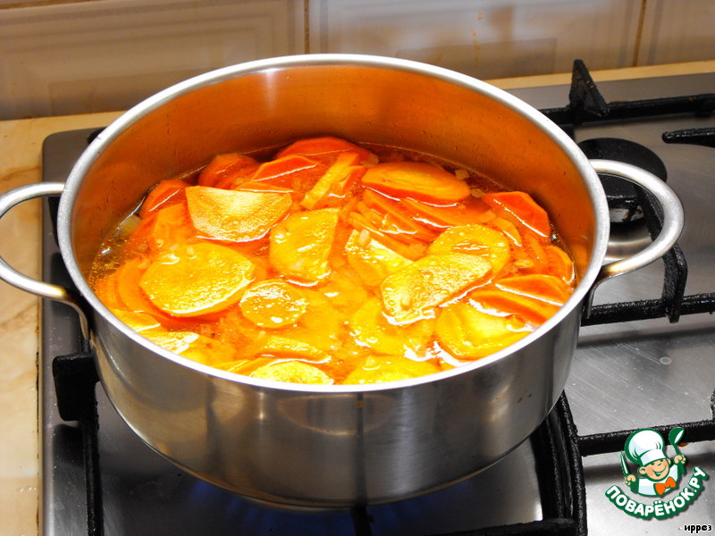 Добавьте морковь, залейте бульоном и доведите до кипения. Накройте крышкой и варите на маленьком огне примерно 30 минут.
