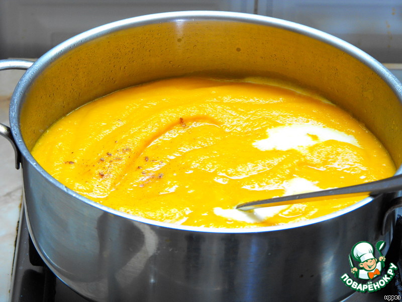 Посолите по вкусу, добавьте апельсиновый сок, сливки и корицу, хорошо перемешайте. Затем снова поставьте кастрюлю на огонь, доведите до кипения и варите ещё 5 минут на маленьком огне.