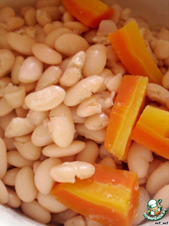Фасоль тщательно промыть и замочить на 5 - 6 часов, можно на ночь. Затем слить воду, ещё раз залить холодной водой, добавить нарезанную крупно морковь и лавровый лист. Варить 40-45 минут.