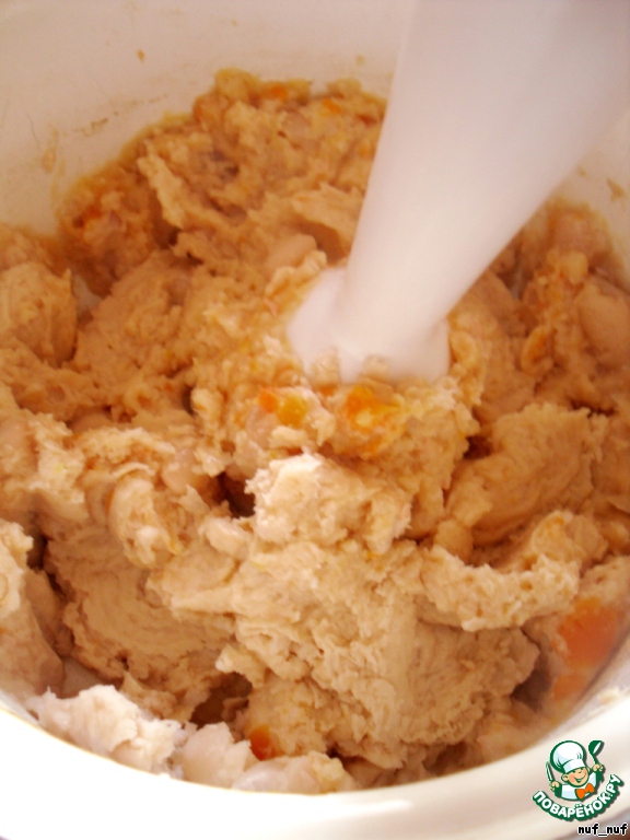 Когда фасоль будет готова, вынуть лавровый лист, слить жидкость и пюрировать фасоль с морковью.
