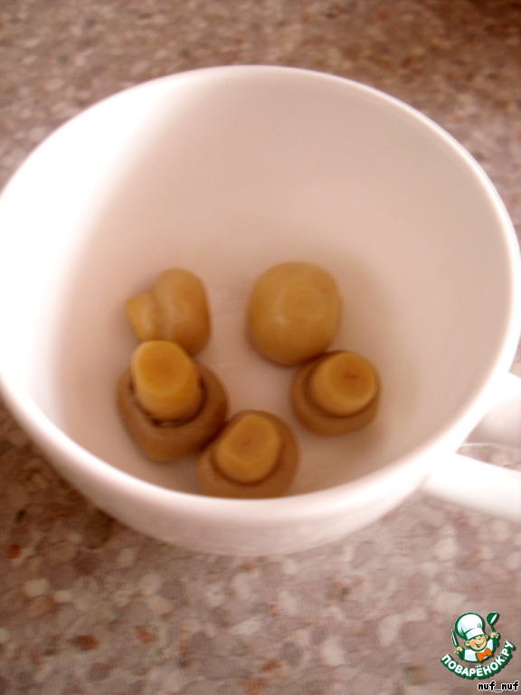 Шампиньоны лучше брать маринованные, они добавляют приятную кислинку. У меня целые и очень мелкие.