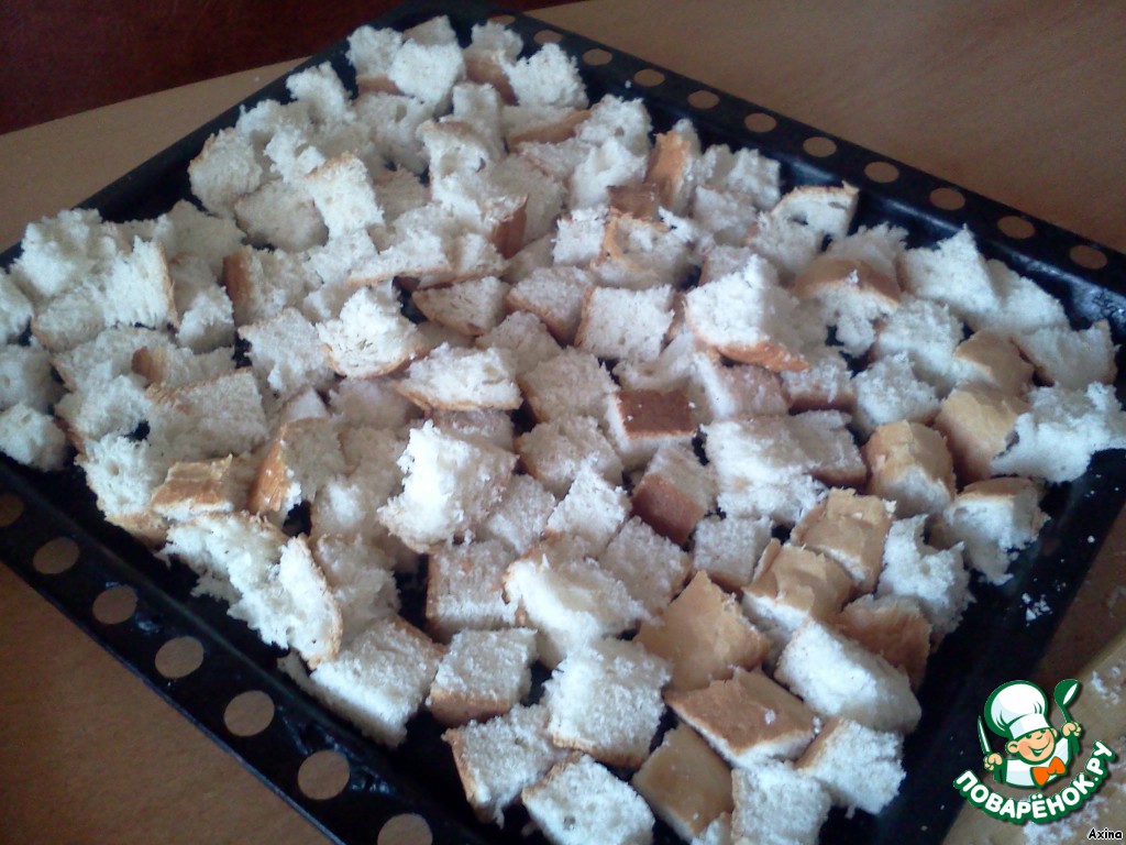 батон нарезать на квадратики и высушить сухари в духовке до золотистого цвета (около 15 мин.),