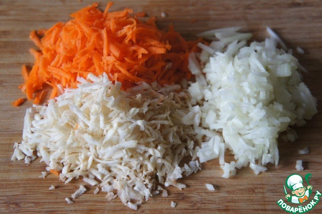Морковь и сельдерей натереть на крупной терке, лук измельчить.