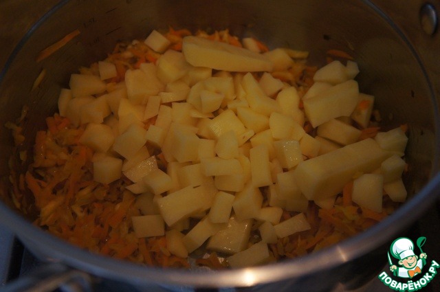 Добавить морковь с сельдереем и спассеровать до полуготовности.