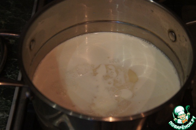 Вернуть суп обратно в кастрюлю, развести горячим молоком.
