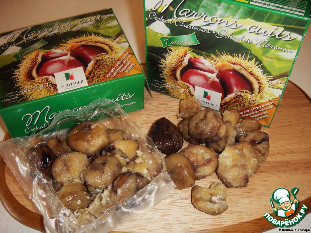 Мне удалось купить только уже готовые каштаны. Если вам посчастливилось достать свежие, то их необходимо очистить от кожуры и замочить в воде на ночь. А на следующий день залить кипятком, чтобы слезла вторая кожица, и промыть холодной водой.