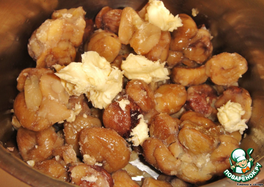 Подготовленные каштаны перекладываем в кастрюлю и добавляем к ним кусочек сливочного масла, растёртого с мукой.