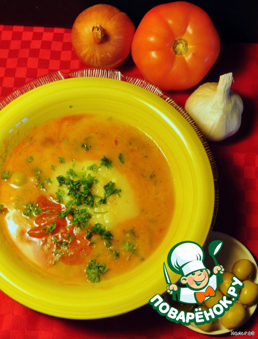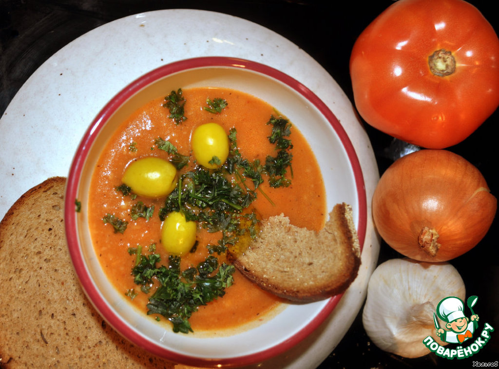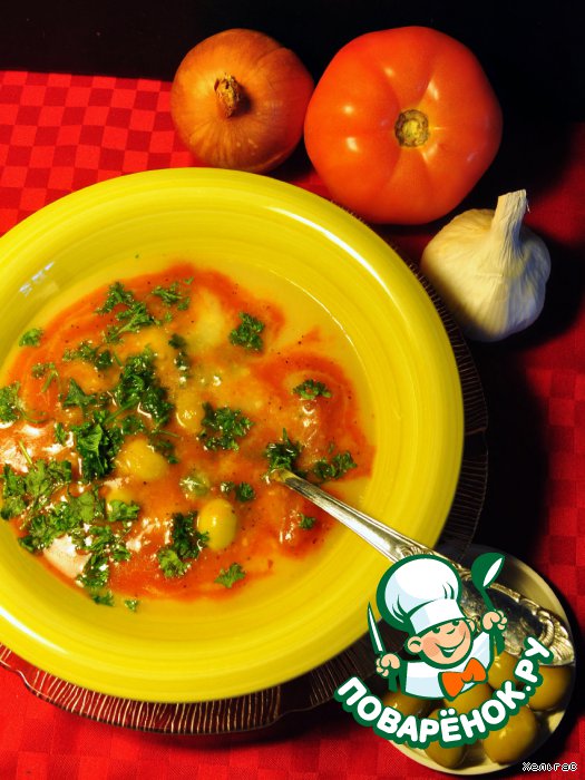| Замечательная комбинация простых овощей, а результат - изысканный суп-пюре. Особую пикантность придают зеленые оливки. |