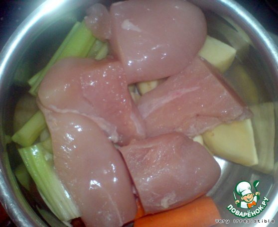 Туда же кладем разрезанное на 2 части куриное филе. Заливаем водой, добавляем 4 горошины душистого перца, соль и ставим на огонь.