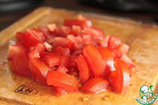 Крупно нарежем 2 спелых помидора. Овощи соединим в кастрюле с чечевицей и поварим еще 5-7 минут.