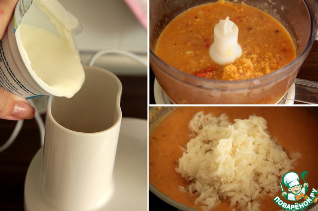 Добавим йогурт, вернем смесь в кастрюлю, добавим рис и курицу.