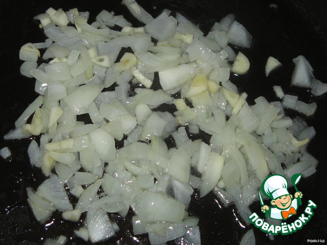 4. В сковороде с разогретым маслом обжарить лук и чеснок.