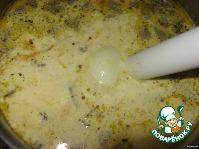 9. Довести на сильном огне до кипения, положить в суп тертый сыр, кипятить 1 минуту, выключить.
