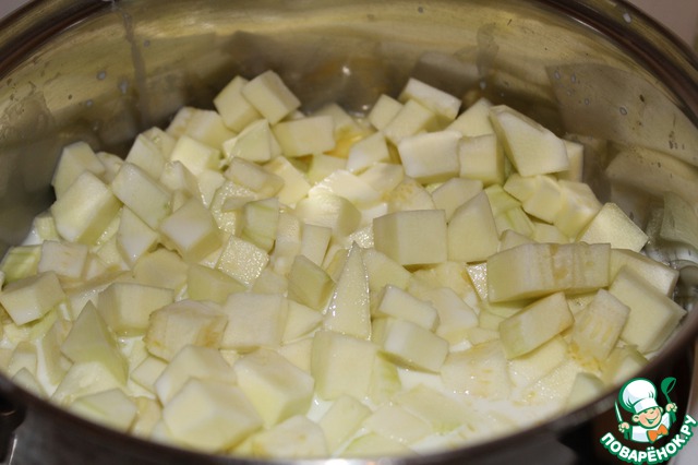Припускаю кабачки в небольшом количестве кипящего молока с маслом. Молока наливаю ровно столько, чтобы оно едва покрывало кабачки. Поэтому, надо признаться, что количество молока в ингредиентах приблизительное.