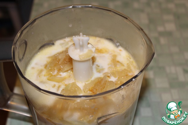 Готовые кабачки вместе с жидкостью и обжаренным луком измельчаю (перетираю) в чаше блендера до однородной массы.