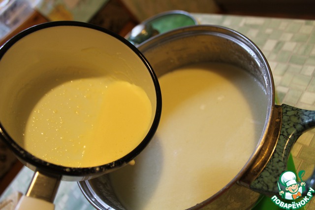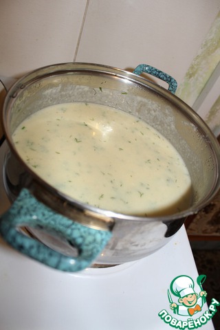 Охлаждаю суп приблизительно до 70-60 градусов, ввожу льезон и прогреваю суп.