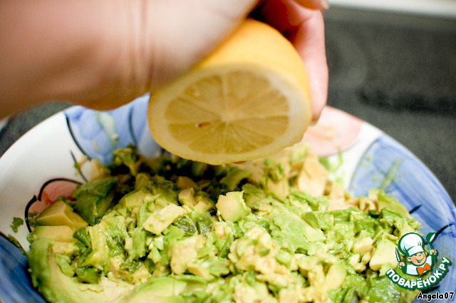 мякоть раздавить вилкой в тарелке и полить соком лимона, чтобы авокадо не потемнел;