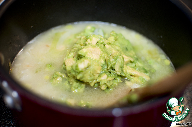 добавить авокадо, довести до кипения, уменьшить огонь и варить 10 минут;