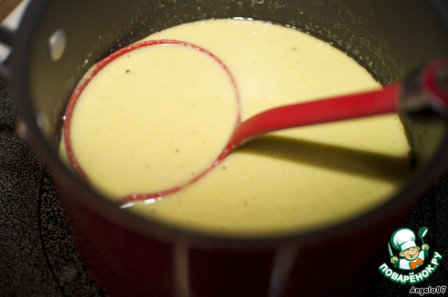 Протертую массу вернуть на огонь, влить сливки, посолить, поперчить и довести до кипения.
