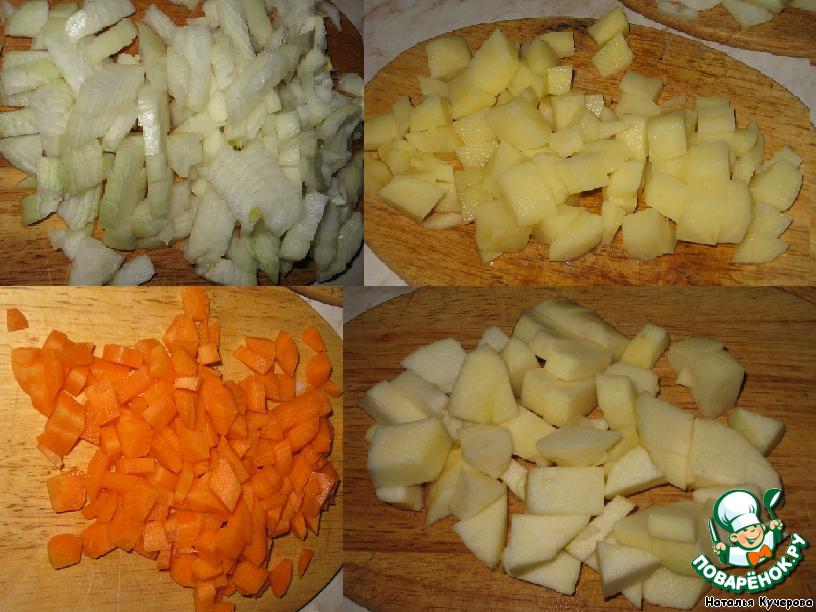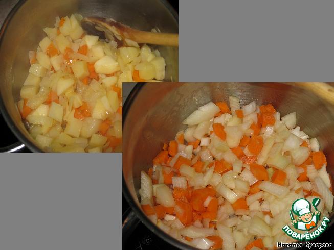 Мелко порезать лук, морковь и яблоко. Очистить картофель и порезать кубиками. В 3 ложках оливкового масла потомить лук и морковь.