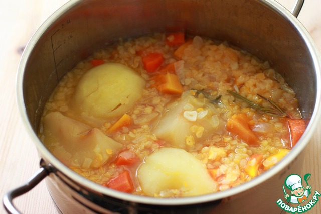 Теперь добавляем яблоки, воду или овощной бульон, душистые травы (я добавила розмарин, но сюда лучше подойдет шалфей) и всыпаем чечевицу. Вода должна лишь слегка покрывать овощи, хотя густоту супа вы можете подстраивать под свой вкус - погуще, пожиже.