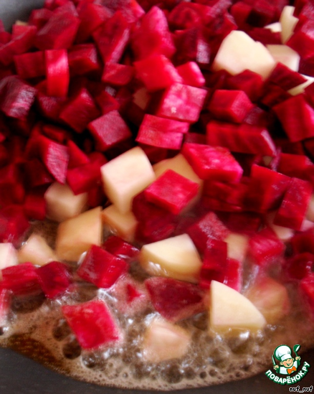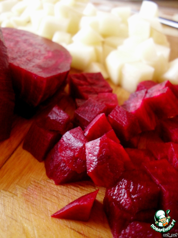 Картофель, грушу и свёклу почистить, нарезать небольшими кубиками