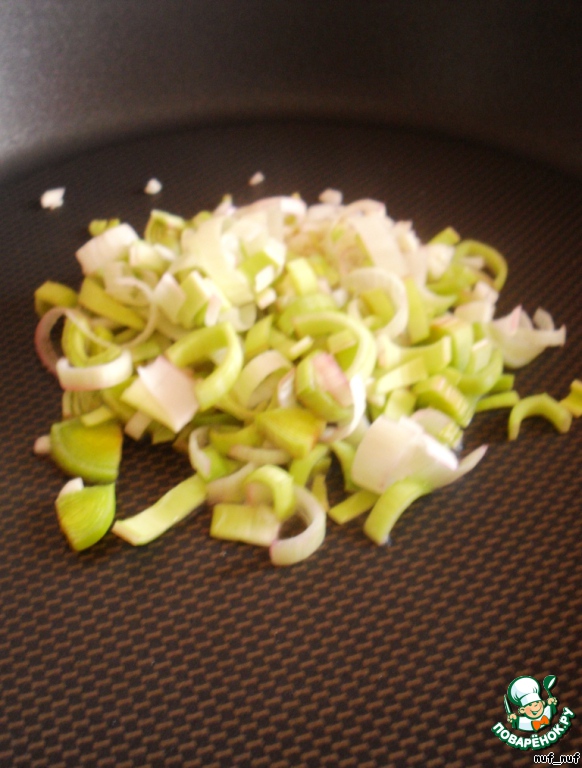 На другой сковороде обжарить лук - порей и чеснок. Чеснок я положила и не жалею. Но, если есть сомнения, то вполне можно обойтись и без него.
