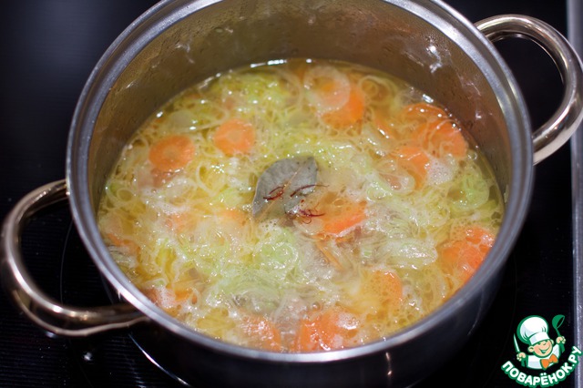 Влить горячую воду, добавить щепотку шафрана и лавровый лист, накрыть кастрюлю крышкой и варить при слабом кипении 10 минут.
