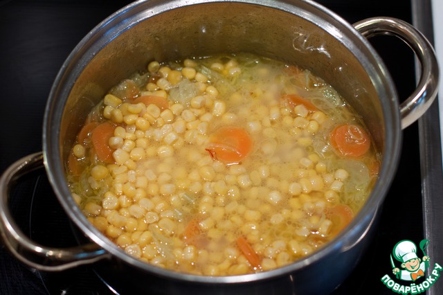 Всыпать замороженную кукурузу, довести суп до кипения, посолить, поперчить, накрыть крышкой и варить еще 15 минут.