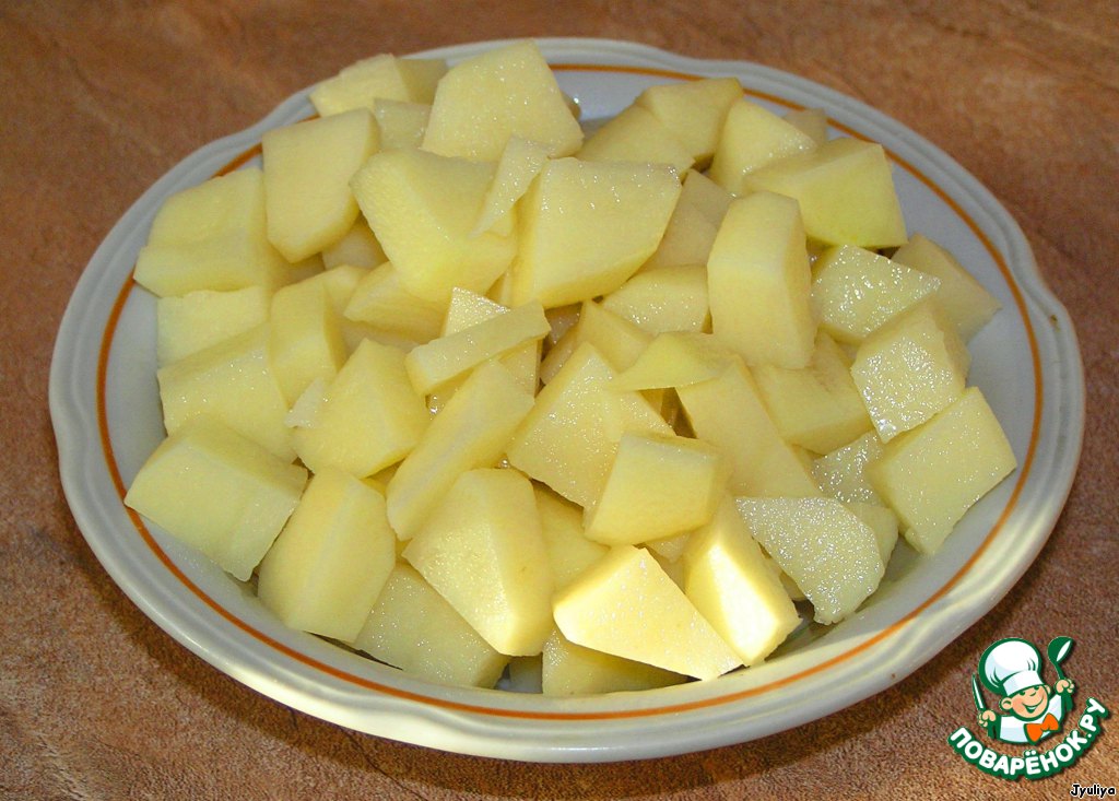 Через 10 минут добавить картофель, нарезанный кубиками. Варить ещё 20 минут.