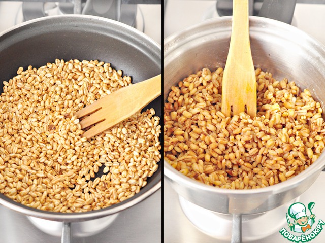 Обсушенную крупу обжарить на сухой тефлоновой сковороде. Обжариваем до светло-коричневого цвета, таким образом, крупа приобретает ореховый привкус. Она уже, практически, наполовину готова и такая вкусная получается. Я её постоянно таскала со сковороды по одной штучке. Такая же "зараза", как и семечки, рука так и тянется за ними...)) Хоть и не по теме, но напишу, что такую обжаренную перловку, думаю, здорово добавлять к мюсли и заливать йогуртом, на завтрак то, что нужно.